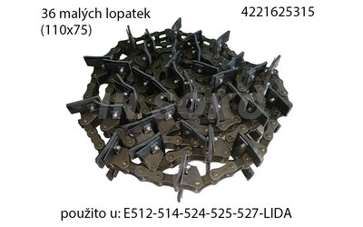 Elevátorový dopravník kláskový kompletní 36 malých lopatek pro sklízecí mlátičku Fortschritt E 512. Tento díl je možné použít i u strojů Fortschritt E 512, E 514, E 524, E 525, E 527 a Lida 1300.